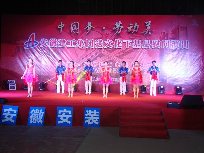 慰问演出在啦啦操《青春的旋律》中正式开始,舞蹈《孔雀舞》、快板《和谐建工绘宏图》、小品《安全一家亲》、男声合唱《游击队之歌、少林少林》、情景朗诵《劳模风采践真情》、现代舞《咱们工人有力量》等多种形式向员工们展示了“中国梦、劳动美”的主题。演员们载歌载舞,用激情的舞蹈、动听的歌喉、幽默的表演,为项目的员工们带来了一场视觉盛宴。演出中,主持人还邀请现场的工友为观众即兴演唱,公司黄俊筠的《说唱脸谱》博得了满堂喝彩,把演出推向高潮。演出结束后,观众们还对最受欢迎的节目进行了现场投票,并进行了现场观众幸运抽奖活动。整场慰问演出气氛热烈,文明欢快。员工们纷纷表示,在自己的工地就能享受一场精彩的演出,无不竖指称赞,夸文艺下基层活动办得真好!