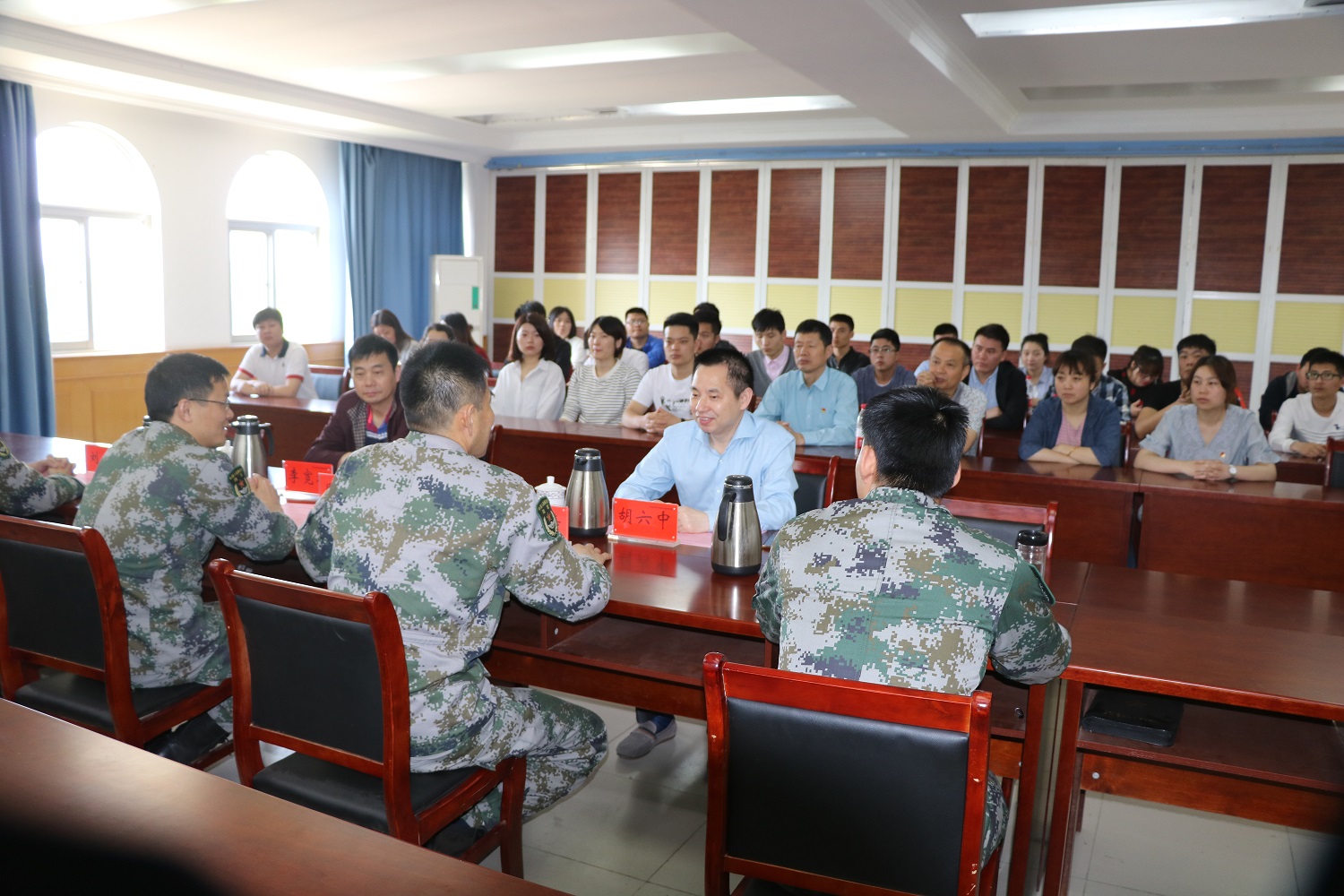 在军地座谈会上,安徽预备役师高炮团团长陈寿、政治处主任周玉兵、后装处长刘春、司令部负责人凌德山出席会议,陈寿团长对安徽安装公司团员青年的到来表示欢迎,并对高炮团的基本情况进行了简要介绍。胡六中书记在座谈会上对此次团员青年走进军营学习,与对方进行了交流,他说,团员青年正值价值观的塑成期,此次走进军营,亲身感受军人的信仰、信念、纪律、本领和血性更是作为国有企业职工持续点燃爱国热情、责任担当的难得机会!