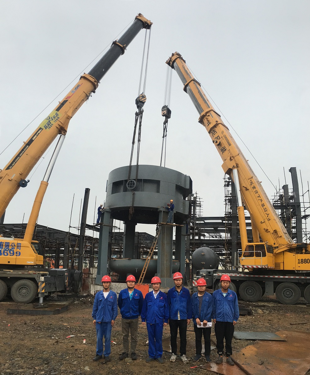 本次吊装的反应器中段部分重达220吨,分公司领导高度重视,吊装前期,邀请公司总工吴继成、总工办主任牛守义和安全部王岳涛经理亲临项目部参与设备吊装的专题方案讨论定稿工作。当日上午,吊装现场准备工作紧张却又有条不紊的进行,项目经理李子凤向全体“参战”员工进行了安全交底,工作人员对两台分别为500T、350T吊车的站位及性能再次确认,现场机具、人员均按既定方案实施。分公司经理史崇松、业主单位负责人、监理全程在现场“督战”,全体工作人员经过四个小时的奋战,吊装作业圆满结束。