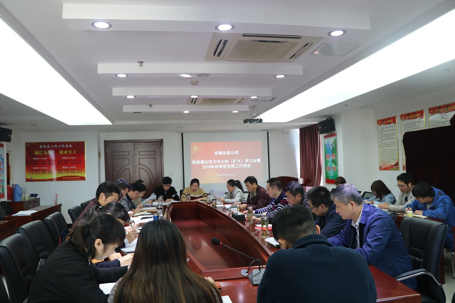 10月27日上午,安徽安装公司召开2018年四季度党群工作例会。会议由公司党委书记、董事长胡六中主持。所属各基层党支部、工会、团支部主要负责同志及公司党群部门人员参加了会议。